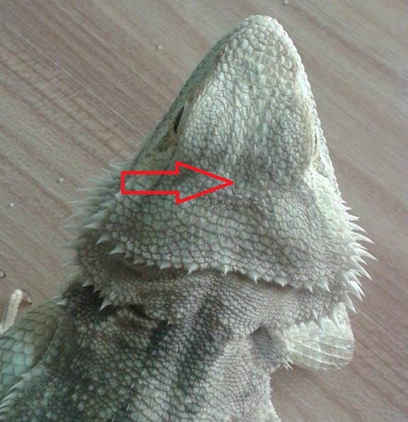 Zhruba ve středu hlavy je vidět malá tečka, většinou černé (tmavé barvy). Je to parietální oko, říká se mu také světlo čivný orgán či třetí oko.